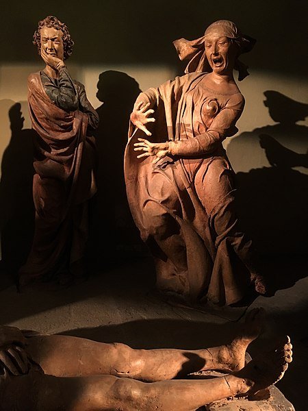 Ed è proprio questo codice di comportamento funebre, ad essere proposto in quest’opera: Giuseppe d’Arimatea e San Giovanni Evangelista sembrano bloccarsi e tenersi tutto dentro, mentre le donne esternano fisicamente il loro dolore. La Madre si ripiega su se stessa congiungendo le mani sul petto, Maria di Salomè si pianta le unghie nelle cosce, Maria di Cleofa protende le mani davanti a sé per schermare la vista insopportabile della morte. La Maddalena, infine, è forse il personaggio più potente dell’intero gruppo: irrompe sulla scena spalancando la bocca in un grido, accompagnata nei movimenti dalle vesti gonfie e chiaroscurate ad enfatizzare ancora di più la sua figura.