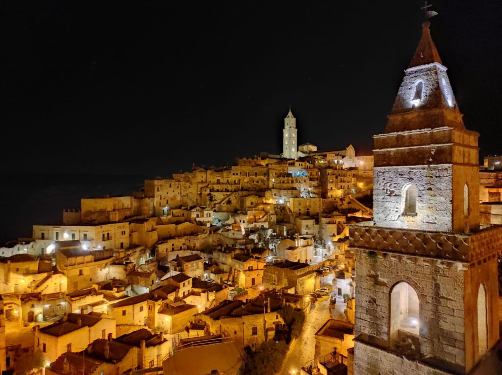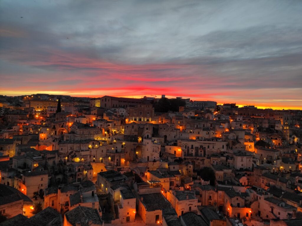Matera infatti è una delle città più antiche del mondo e, scolpita nella pietra, mostra tutta la sua bellezza soprattutto al tramonto. Le luci delle case si accendono, le strade vengono inondate dalla luce calda dei lampioni e dei pochi raggi del sole rimasti e il paesaggio muta forma trasportandoci in un’altra epoca che ricorda la Galilea al tempo della nascita di Gesù.
