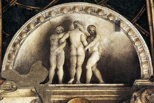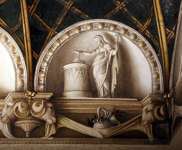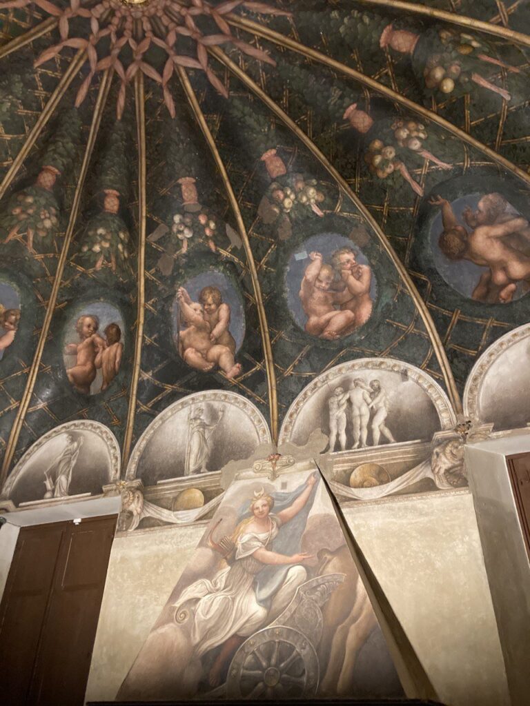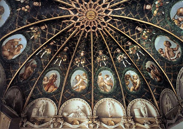 Non era la prima volta che Correggio si cimentava in una decorazione a pergolato di una volta: lo aveva fatto in precedenza all’interno della cappella funeraria di Andrea Mantegna, nella Basilica di Sant’Andrea a Mantova.