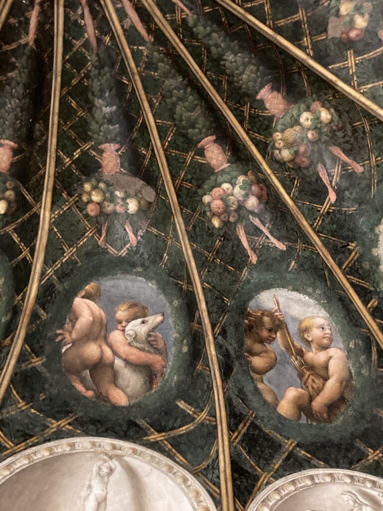 Il raffinato esercizio di finzione illusionistica incanta e trascina lo sguardo in ogni suo dettaglio. Non è difficile scorgere nella vivacità e graziosità dei putti il modello di Raffaello, così come il tema mitologico e archeologico, unitamente alla soluzione del pergolato, sembrano un richiamo alla volta della Loggia di Psiche a Roma. Correggio avrà certamente desiderato ammirare i cantieri raffaelleschi della Loggia della Villa della Farnesina durante il suo viaggio romano.