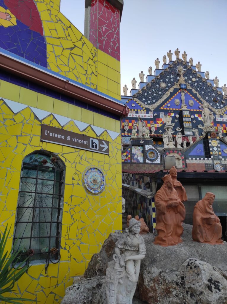 Colori, forme e stili diversi convivono tra di loro in questo regno. Molti scorci rimandano a Parc Güell a Barcellona, ma siamo solo a Guagnano. Vincenzo negli anni trascorsi nella sua città ha accumulato un numero considerevole di opere sue e di altri artisti. Camminando fuori dalla galleria e dalla sua casa infatti ci accorgiamo di essere circondati da sculture e mosaici coloratissimi. Qui sacro e profano si mischiano creando uno stile unico e stravagante.