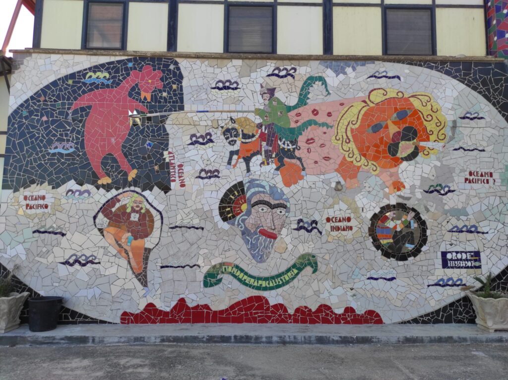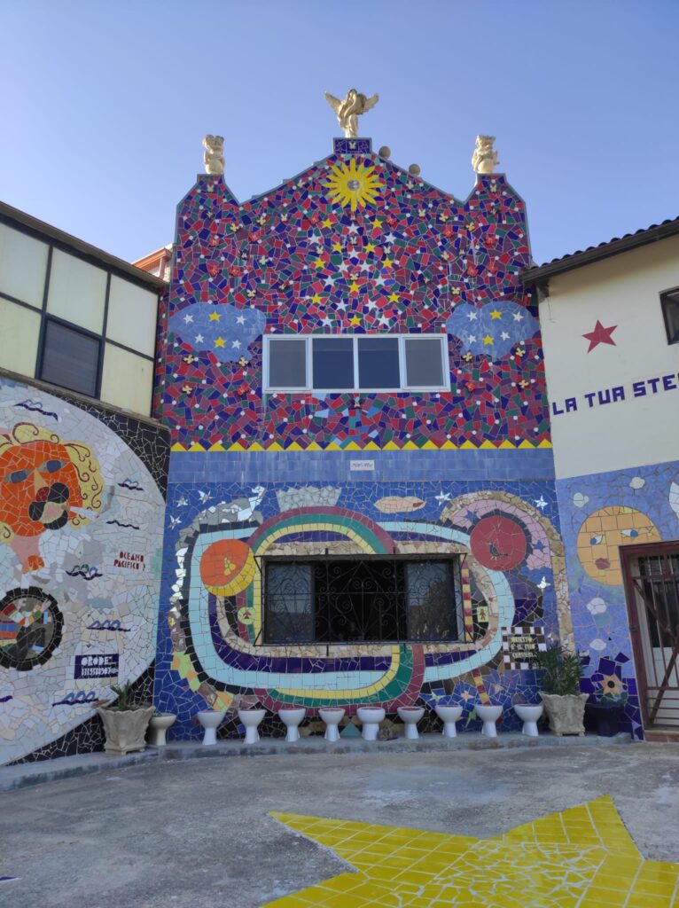 Le facciate degli edifici sono ricoperte da vivaci piastrelle colorate che brillano sotto la luce del sole. Su alcune di esse si possono leggere pensieri che rimandano alla pace, alla libertà e alla felicità. Altre invece sono ricoperte da disegni: un mappamondo dove ogni continente ha una propria raffigurazione o mosaici di personaggi che spaziano da Maradona al Papa.
