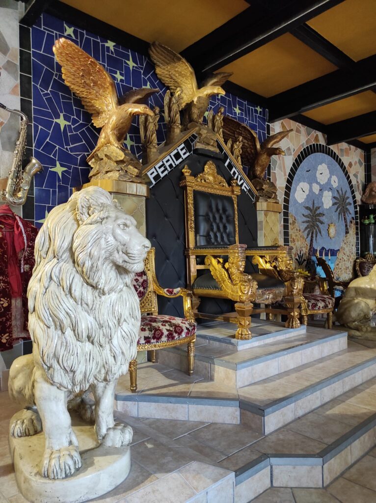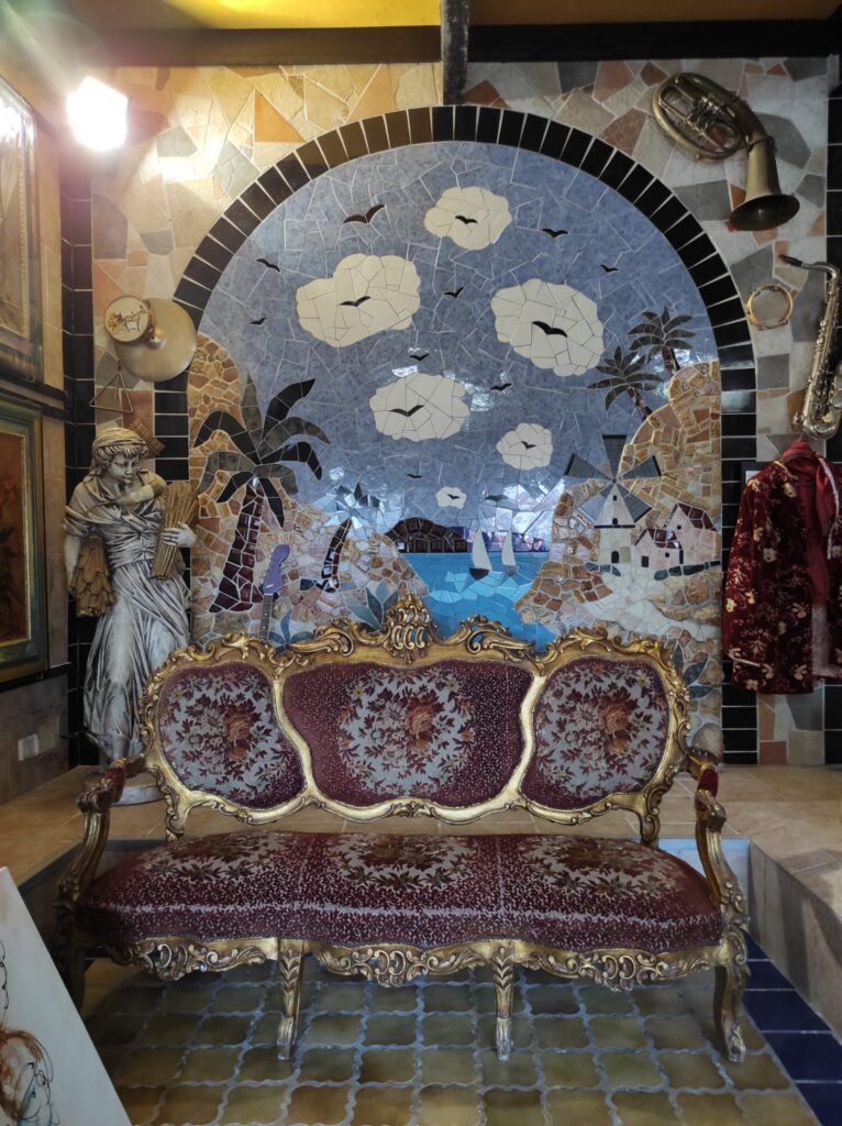 Il nostro tour continua all’interno della sua casa anch’essa ricca di opere collezionate negli anni. È un posto davvero incredibile con diverse zone, ognuna con uno stile diverso. Anche qui la maggior parte delle pareti è ricoperta da piastrelle colorate, affreschi o semplicemente tappezzata di quadri. Dagli arredi e dalle composizioni viene fuori tutta la fantasia dell’artista che gioca a mixare stili e colori diversi.