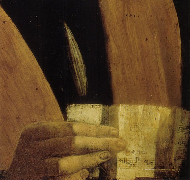 In seguito ai restauri effettuati nel 1905, poi, è stato reso possibile leggere sul cartiglio che il musico regge in mano alcune note su un pentagramma e la scritta “CAN[tor]ANG[elicum]”: questi elementi sono risultati fondamentali per correggere l’identificazione del soggetto ritratto.